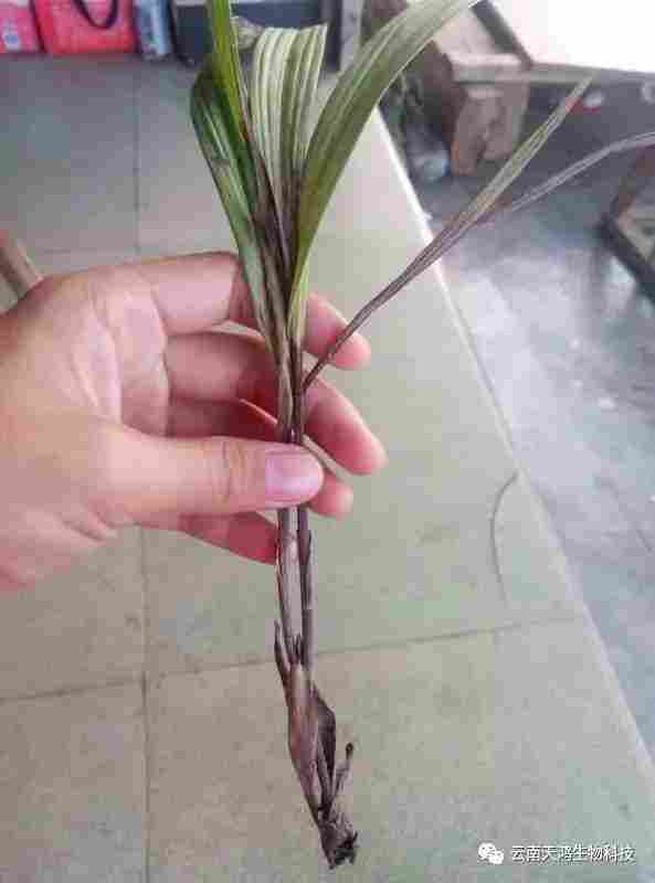 植株和塊莖均可感染。病株生長緩慢,矮小直立,莖葉逐漸變黃,頂部葉片向中脈卷曲,有時(shí)萎蔫??康孛娴那o基部變黑腐爛,有粘液和臭味,很容易從土壤中拔出。發(fā)病晚的植株能結(jié)染病程度不同的白芨莖塊,橫斷面切開,可以看到維管束已變黑色,并從臍部開始腐爛。感病重的薯塊,在田間就已經(jīng)腐爛,發(fā)出難聞的氣味。嚴(yán)重時(shí)莖塊爛成空腔,輕者只是臍部變色,甚至看不出癥狀。